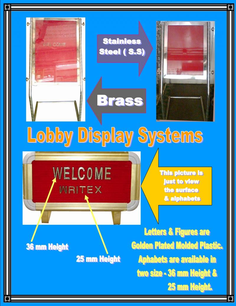 We manufacture various types of Lobby Display Systems. It comprises of Lobby stands made of Stainless Steel, Iron Steel, or Brass. Boards can be Pinup Display Boards with or without Glass Shutter, Velwet covered Grooved Boards with or without Acluminium Glass Shutter or any other Display Boards can be fitted on Lobby Stands.